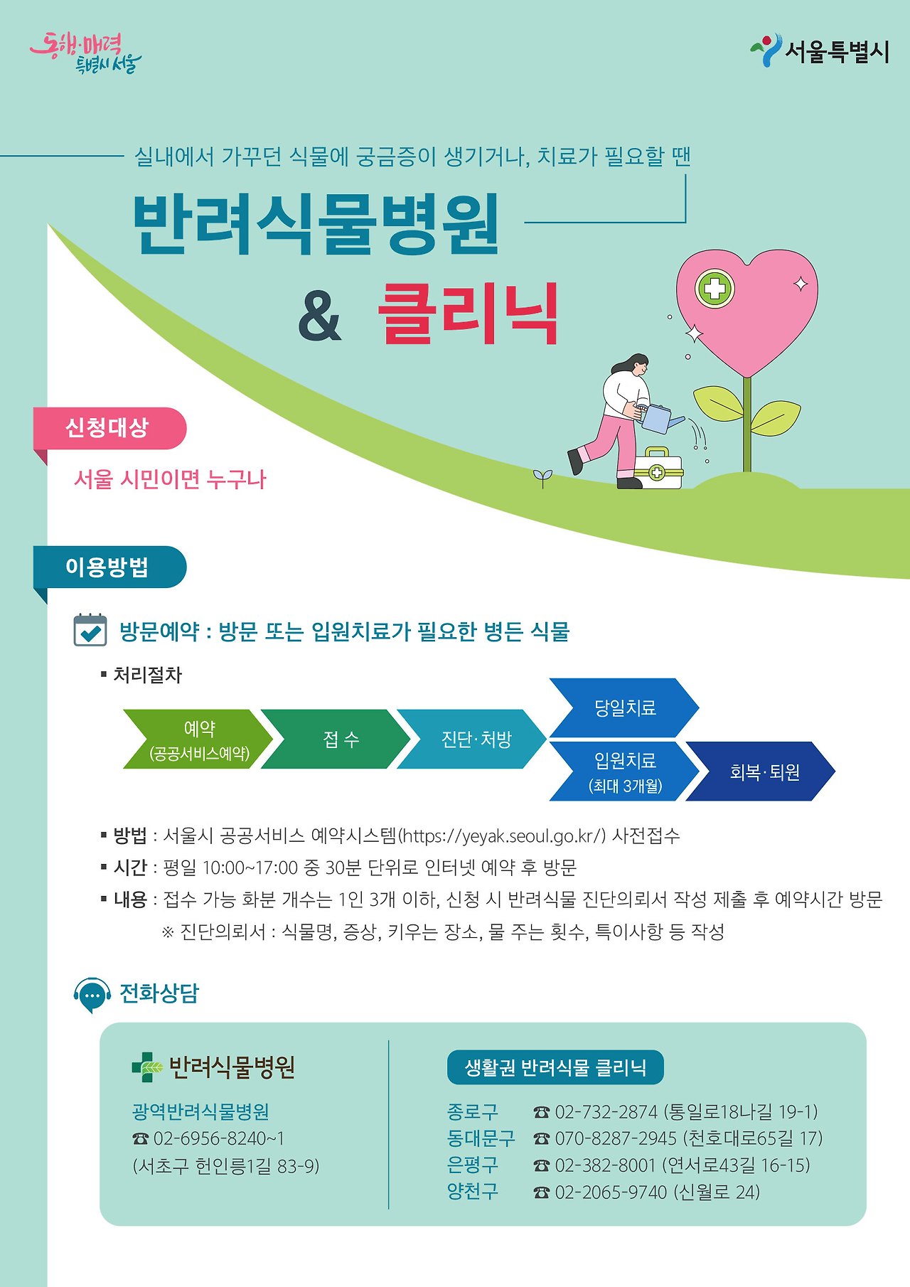 서울시 반려식물병원은 사전예약 후 방문해 진단, 치료, 입원, 교육 순서로 운영됩니다.